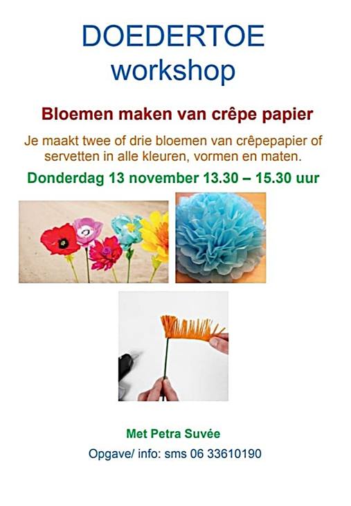 Op donderdag 13 november van. 13.30 – 15.30 uur organiseert de werkplaats voor blijdschap en verbinding ‘Doedertoe‘ een workshop bloemen maken van crêpe papier. De …