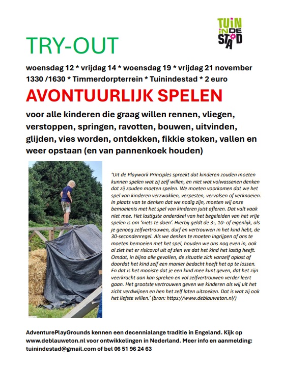 Ter info: ouders kunnen zichzelf vermaken op Tuinindestad of elders (in het Westpark). Ter geruststelling: er zijn 2 ingevoerde playworkers actief aanwezig.