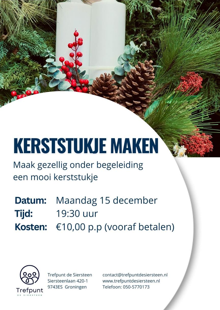 Op maandagavond 15 december om 19.30 uur ben je in Trefpunt de Siersteen aan de Siersteenlaan 420-1 in Vinkhuizen welkom om onder begeleiding een mooi kerststukje te maken.