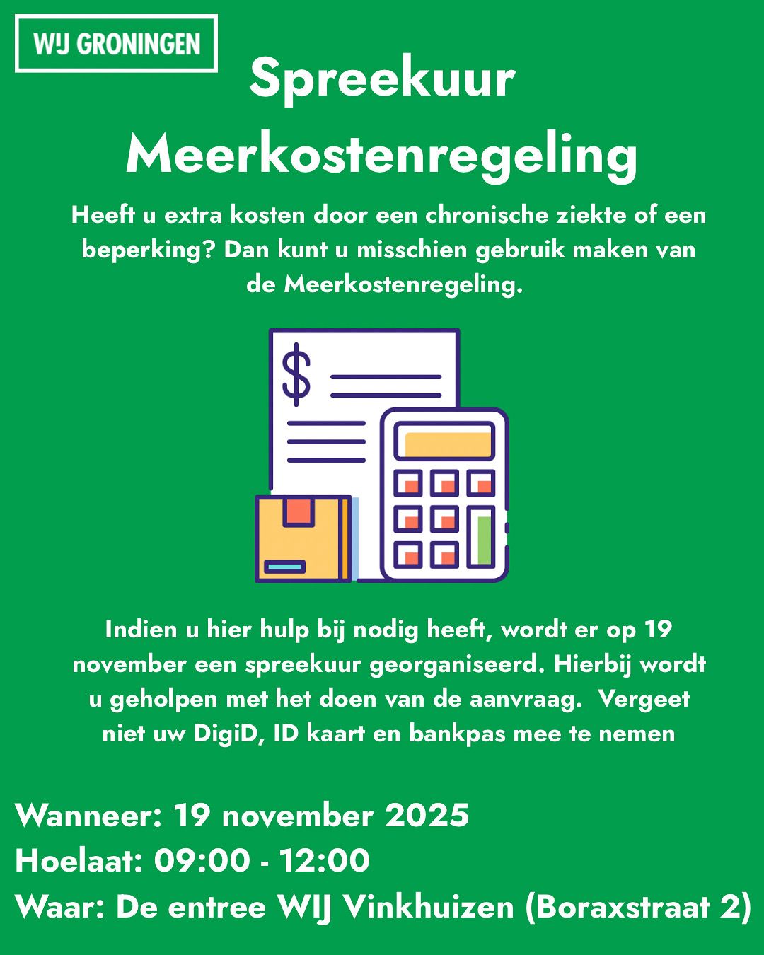 Indien u hier hulp bij nodig heeft, wordt er op 19 november een spreekuur georganiseerd. Hierbij wordt u geholpen met het doen van de aanvraag.