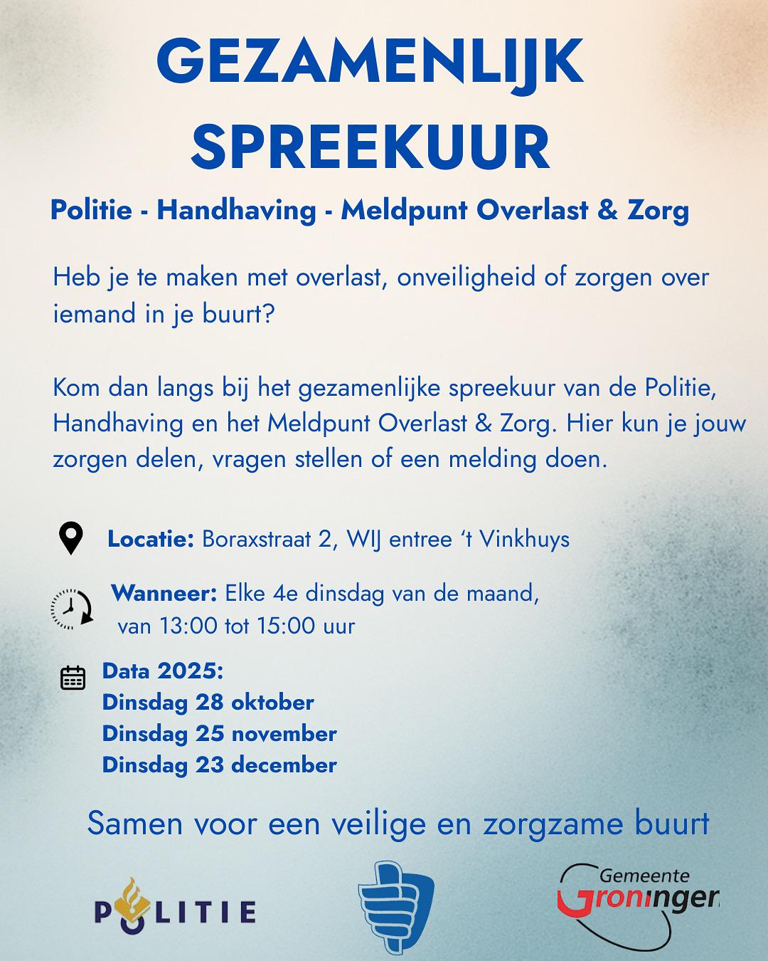 Kom dan langs bij het gezamenlijke spreekuur van de Politie, Handhaving en het Meldpunt Overlast & Zorg. Hier kun je jouw zorgen delen, vragen stellen of een melding doen.