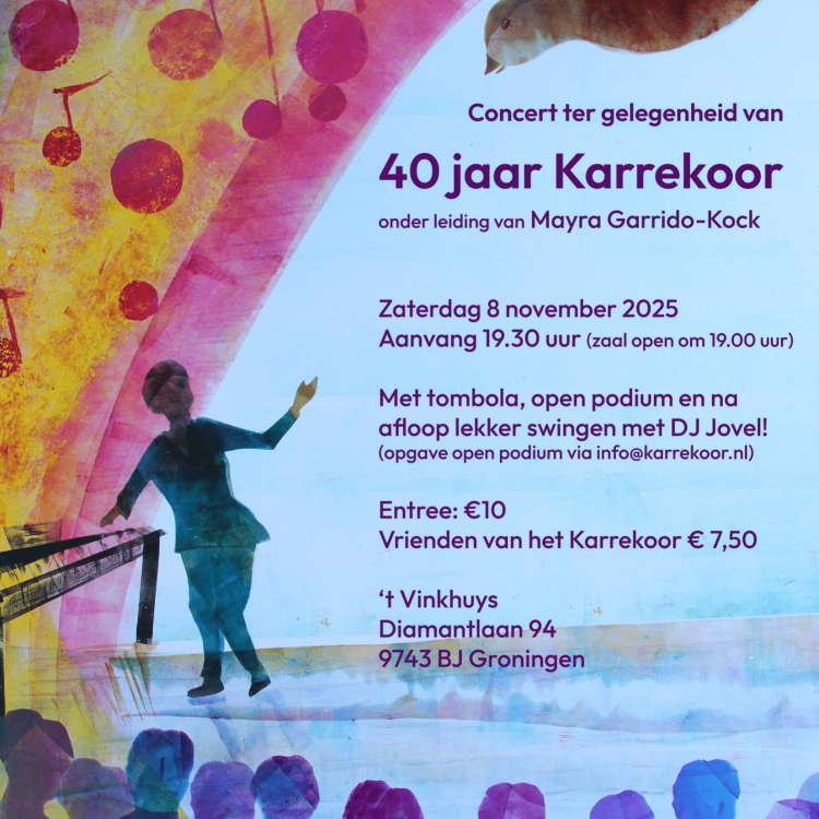 Kom naar het concert van Karrekoor, ten ere van hun 40-jarig bestaan. Met tombola, open podium en DJ Jovel.